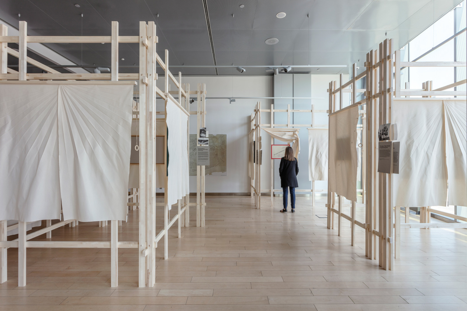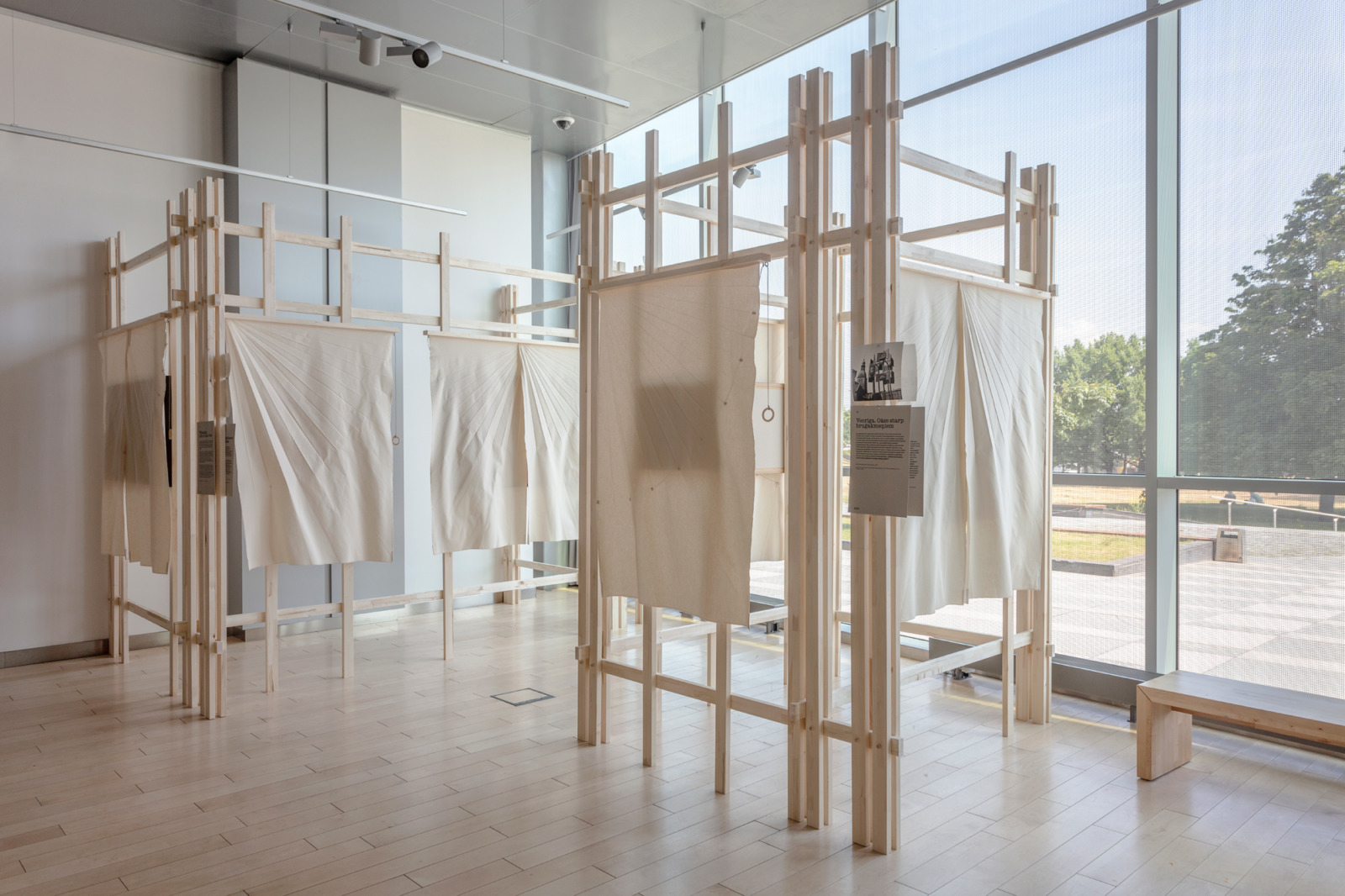 The exhibition design process started with search for materials to be up-cycled from Riga City parks. We found waste-wood from old park benches and old concrete trash bins. Fabric curtains protect the historical park drawings from direct sun rays.